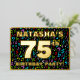 The front of this fun seventy-fifth birthday party foil invitation card design features a personalised name, a large number “75th”, the message “BIRTHDAY PARTY!”, and a border. The background of the front has a joyful, multicolored musical symbols pattern. The back features personalised details about the event, such as the date, time, place/venue, and any other information that may be useful. Customised invitations like these might be a fun way to invite guests to a birthday party being held in celebration of somebody’s 75th birthday. These might be more meaningful for a music-themed birthday party. [~Z0000601]