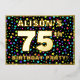 The front of this fun and joyful seventy-fifth birthday celebration/party foil invitation card design features an editable name, a large number “75th”, the message “BIRTHDAY PARTY!”, and a border. The background of the front has an exciting, multicolored pattern of stars. The back features personalised details about the event, such as the date, time, venue, and any other information that may be relevant. Customised invitations like these might be a fun way to invite attendees/guests to a birthday gathering being held to honour somebody’s 75th birthday. [~Z0000600]