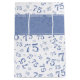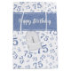 This design is a blue and white, random number pattern with milestone number 75 repeated in varied sizes and angles. There are a printed ribbon banner and a gift tag with text templates to change to your own words, name, initials, or monogram.