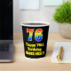 This exciting and colourful birthday themed paper cup design features a large number “76” having a rainbow spectrum gradient inspired pattern. It also features the message “Happy 76th Birthday,”, and a personalised name. The background is coloured black. Vibrant, colourful paper cups like this might be fun to have at a birthday party being held to honour somebody’s 76th birthday. [~Z0000537]