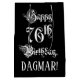 This opulent and luxurious birthday-themed gift bag design features the message “Happy 76th Birthday,” in formal script style text, on a black coloured background. It also features a custom recipient name. An ornate gift bag like this might be used when giving a gift or present in honour of somebody’s seventy sixth birthday. [~Z0000557]