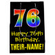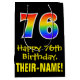 This exciting, fun, and colourful birthday-themed giftbag design features a large number "76" with a rainbow spectrum gradient style pattern, along with the message "Happy 76th Birthday,", and a customisable recipient name. The background is coloured black. A gift bag like this might be used when wrapping gifts being given to somebody in celebration of their 76th birthday. [~Z0000512]