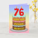 This cheerful and fun birthday-themed greeting card design features a cartoon-style depiction of a three-tier birthday cake having number-shaped candles on top showing the age “76“, along with the message “HAPPY 76TH BIRTHDAY,”, and a custom recipient name. The background of the front has a multi-colour pastel rainbow spectrum inspired gradient pattern. The inside has a personalised birthday greeting message, or could perhaps be cleared and left blank if a message is to be written by hand instead. A joyful, personalised birthday greeting card like this might be sent in celebration of somebody’s seventy-sixth birthday. [~Z0000625]