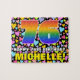 This colourful and fun birthday jigsaw puzzle design features a large number “76” with a multicolored rainbow spectrum inspired gradient pattern, along with the message “HAPPY 76th BIRTHDAY,”, and a personalised recipient name. The background has an upbeat, colourful, heart shapes pattern. A vibrant, customised birthday puzzle like this might be a fun way to deliver a birthday greeting message to somebody who is celebrating their seventy-sixth birthday. [~Z0000611]