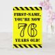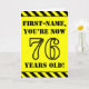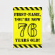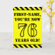 The front of this bold and attention-grabbing birthday themed greeting card design features a custom name and the message "YOU’RE NOW 76 YEARS OLD!" in black stencil style text on a yellow colored background. There is also an eye-catching black and yellow striped pattern at the top and bottom edges of the front. The inside features a customized birthday greeting message, or could perhaps be cleared and left blank if a message is to be written by hand instead. A personalized birthday card like this might be a fun way to send a message in celebration of somebody’s seventy sixth birthday. [~Z0000413]