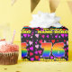 This fun and cheerful birthday wrapping paper design features a large number “76” with a rainbow spectrum gradient inspired pattern, along with the message “Happy 76th Birthday,”, and a personalised name. The background features a pattern of red, purple, and pink heart shapes of various sizes. Wrapping paper like this might be used when wrapping gifts being given to somebody in celebration of their 76th birthday. [~Z0000549]
