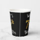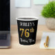 This fancy and ornate birthday-themed paper cup design features a personalised name and the message “76th Birthday Party”. The large number “76th” has an imitation/faux gold-inspired colouring pattern, and the words “Birthday Party” are in opulent script-style text. The background is coloured black by default (although it can be customised). Elegant, luxurious paper cups like this might be used at a birthday party being held in celebration of somebody’s seventy sixth birthday. [~Z0000567]