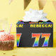 This cheerful, fun, and colourful birthday wrapping paper design features a large number "77" and the message "HAPPY BIRTHDAY,", both coloured with a rainbow spectrum gradient inspired pattern, along with a bold yellow personalised recipient name. The background is coloured black. Fun birthday themed wrapping paper like this might be used when giving a gift or present in celebration of somebody’s 77th birthday. [~Z0000475]