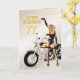 A girl with a motorcycle pointing at the Happy Birthday message.. A great card for the man who loves his bikes!