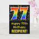 The front of this fun, colorful, and vibrant birthday themed greeting card design features a large number "77" having a rainbow spectrum gradient inspired pattern. It also features the message "Happy 77th Birthday,", and a customizable recipient name. The front also has a pattern of various music notes and symbols having a variety of colors and sizes. The inside features a custom birthday greeting message, or could perhaps be cleared and left blank if a message is to be written by hand instead. A personalized birthday card like this might be a fun way to send birthday wishes to a musician, singer, composer, or somebody else who is celebrating their seventy seventh birthday. [~Z0000420]
