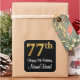 This elegant, sophisticated, and stylish birthday-themed sticker design features a large ordinal number “77th” having a faux/imitation gold-inspired gradient pattern, plus the birthday greeting message “Happy 77th Birthday,” and a personalised name in a script-style font. The background is coloured black. Sophisticated stickers this might be used when wrapping a gift or present in honour of somebody’s 77th birthday, or perhaps might be handed out to the attendees at a birthday party. [~Z0000517]