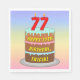 This upbeat and colourful birthday paper napkin design features a cartoon-style depiction of a three-tier birthday cake having numeral-shaped candles on top showing the number “77“, along with the message “HAPPY 77TH BIRTHDAY,”, and a custom recipient name. The background has a multicolored pastel rainbow spectrum inspired gradient pattern. Paper napkins like these might be used at a party held in celebration of somebody’s seventy seventh birthday. [~Z0000623]