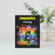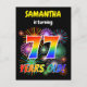 The front of this vibrant and lively birthday party invitation postcard design has a personalised name, a fun bursting celebratory fireworks inspired pattern, and the message "77 YEARS OLD!" having a colourful rainbow spectrum inspired gradient pattern. The back features a customisable message that could include details about the birthday party, such as when it is happening and where it is being held. Invitation postcards like this might be sent to potential attendees of a party being held to celebrate the birthday of somebody who is turning 77 years old. [~Z0000452]