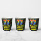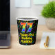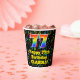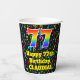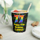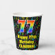 This colourful and cheerful music-themed birthday paper cup design features a large number “77” having a rainbow spectrum gradient inspired pattern. It also features the message “Happy 77th Birthday,”, and a custom name. The background features a multicolored pattern having music notes and symbols of various sizes and colours. Vibrant, colourful paper cups like this might be fun to have at a birthday party being held in celebration of somebody’s seventy seventh birthday. [~Z0000541]