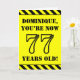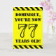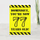 The front of this bold and attention-grabbing birthday-themed greeting card design features a custom name and the message "YOU’RE NOW 77 YEARS OLD!" in black stencil look text on a yellow coloured background. The front also features an eye-catching yellow and black striped pattern at the top and bottom edges. The inside features a personalised birthday greeting message, or could perhaps be cleared and left blank if a message is to be written by hand instead. A customisable birthday card like this might be a fun way to send birthday wishes to somebody who is celebrating their seventy seventh birthday. [~Z0000413]