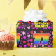 This joyful and fun birthday wrapping paper design features a large number “77” having a rainbow spectrum gradient inspired pattern. It also features the message “Happy 77th Birthday,”, and a personalised name. The background features a pattern of pink, red, and purple heart shapes of various sizes. Wrapping paper like this might be used when wrapping gifts being given to somebody in celebration of their 77th birthday. [~Z0000549]