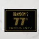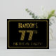 The front of this vintage-appearance seventy-seventh birthday celebration/party foil invitation features a customisable name, a large art deco look inspired number “77TH”, the message “BIRTHDAY PARTY!”, and a border pattern consisting of lines. There is a black-coloured background on the front by default, but it can be customised to a different colour if desired. The back features personalised details about the event, such as the date, time, location, and any other information that may be relevant. Luxurious, elegant, customised invitations like these might be used to invite guests to a birthday party being held to honour somebody’s 77th birthday. [~Z0000590]