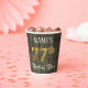 This elegant and ornate birthday themed paper cup design features a personalized name and the message “77th Birthday Party”. The large number “77th” features an imitation/faux gold-inspired coloring pattern, the words “Birthday Party” are in fancy script-style text, and the background has an imitation/faux woodgrain-inspired look. Opulent, luxurious paper cups like this might be used at a birthday party being held to celebrate somebody’s seventy seventh birthday. [~Z0000568]