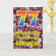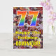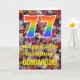 The front of this colorful, autumn-themed, and nature-inspired birthday greeting card design features a large number "77" having a rainbow spectrum gradient inspired pattern. It also features the message "Happy 77th Birthday,", and a custom name. The front features a background depicting rustic fallen autumn leaves. The inside features an editable birthday greeting message, or could perhaps be cleared and left blank if a message is to be written by hand instead. A customizable birthday card like this might be a fun way to acknowledge somebody’s seventy seventh birthday. [~Z0000384]