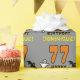 This spooky and scary Hallowe'en birthday themed wrapping paper design features a large number "77" and the message "HAPPY BIRTHDAY,", plus a personalised name. There are also depictions of a ghost and a bat on the front. Wrapping paper like this might be used when wrapping presents that are being given to somebody whose seventy seventh birthday falls on Halloween (October 31st). [~Z0000411]