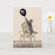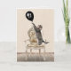 Grey tabby cat reaching for a black balloon on an old-fashioned chair for 77th birthday.