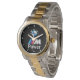 Very good quality watch that looks good whether dressing up or down. The band is sturdy. The watch is rather large so might not work for smaller folks. Recommended as a good gift. Printing is just a touch light but adds a nice touch of personalization.