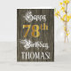 The front of this ornate and elegant birthday greeting card design features the message “Happy 78th Birthday,”, and a custom recipient name. Part of the message is in formal script-style text. The large number “78th” features a faux/imitation gold-inspired look pattern. The background has a faux/imitation woodgrain-inspired pattern. The inside has a custom birthday greeting message, or could perhaps be cleared and left blank if a message is to be written by hand instead. An elaborate, personalised birthday greeting card like this might be sent in celebration of somebody’s seventy-eighth birthday. [~Z0000561]
