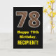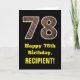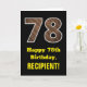 This rustic, fun birthday-themed greeting card design features a large number "78" having an imitation wood grain inspired look pattern on the front. The front also features the birthday greeting message "Happy 78th Birthday,", and an editable recipient name. The inside features a personalized birthday greeting message, or could perhaps be cleared and left blank if a message is to be written by hand instead. A customizable birthday card like this might be a fun way to send a message in celebration of somebody’s seventy eighth birthday. [~Z0000433]