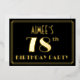 The front of this 1920s-1930s style inspired seventy-eighth birthday celebration/party foil invitation features a customisable name, a large art deco style inspired number “78th”, the message “BIRTHDAY PARTY”, and a border pattern consisting of lines. The front also features a black-coloured background by default, but it can be customised to a different colour if desired. The back features personalised details about the event, such as the date, time, venue, and any other important information. Elegant, luxurious, customisable invitations like these might be used to invite guests to a birthday gathering being held in celebration of somebody’s 78th birthday. [~Z0000591]
