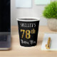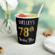 This elegant and luxurious birthday-themed paper cup design features a custom name and the message “78th Birthday Party”. The large number “78th” has a faux/imitation gold-inspired colouring pattern, the words “Birthday Party” are in ornate script-style text, and the background is coloured black by default (although it can be customised). Fancy, ornate paper cups like this might be useful at a birthday celebration being held to honour somebody’s 78th birthday. [~Z0000567]