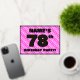 The front of this fun and upbeat seventy-eighth birthday celebration/party foil invitation card design features a customisable name, a large number “78th”, the message “BIRTHDAY PARTY!”, and a border. The background of the front has a joyful light pink and dark pink striped pattern, with heart shapes. The back features personalised details about the event, such as the date, time, location/venue, and any other relevant information. Personalised invitations like these might be a fun way to invite attendees/guests to a birthday gathering/party being held to honour somebody’s 78th birthday. [~Z0000603]