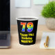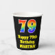 This exciting and fun birthday themed paper cup design features a large number “79” having a rainbow spectrum gradient inspired pattern. It also features the message “Happy 79th Birthday,”, and a customisable name. The background is coloured black. Colourful, vibrant paper cups like this might be fun to use at a birthday celebration/party being held to honour somebody’s 79th birthday. [~Z0000537]