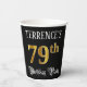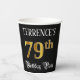This opulent and luxurious birthday-themed paper cup design features a personalised name and the message “79th Birthday Party”. The large number “79th” has an imitation/faux gold-inspired colouring pattern, and the words “Birthday Party” are in ornate script-style text. The background is coloured black by default (although it can be customised). Fancy, elegant paper cups like this might be useful at a birthday celebration/party being held in celebration of somebody’s 79th birthday. [~Z0000567]