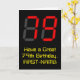 The front of this silly and geeky birthday-themed greeting card design features a large number "79" with a red seven segment digital display style appearance, along with the message "Have a Great 79th Birthday," and a custom name, on a black coloured background. The inside features a personalised birthday greeting message, or could perhaps be cleared and left blank if a message is to be written by hand instead. A customisable birthday card like this might be a fun way to acknowledge somebody’s seventy ninth birthday. [~Z0000386]
