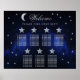 A 7 tables wedding seating chart for a celestial wedding theme, with the moon and star on a starry night blue background. The table numbers are written in big silvery grey stars. The moon, the stars and the word Welcome (written in an elegant calligraphic script) are silvery grey, the rest of the text is white.