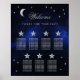 A 7 tables wedding seating chart for a celestial wedding theme, with the moon and star on a starry night blue background. The table numbers are written in big silvery grey stars. The moon, the stars and the word Welcome (written in an elegant calligraphic script) are silvery grey, the rest of the text is white.