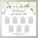 This beautiful 7 table floral seating chart features a rustic boho chic design with hand painted watercolor roses, blossoms and flowers in shades of white, ivory, and cream, along with eucalyptus leaves and garden greenery. The title reads "Welcome! please find your table" written in elegant olive or sage green script calligraphy. There is space for the names of the couple and wedding date at the bottom. This chart has table assignments for 70 guests with 10 seats per table. Wonderful way to welcome guests to your reception while making it easy for them to find their seats.