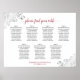 This beautiful wedding seating chart includes seating for 7 tables or 70 guests with 10 seats per table. The chic sophisticated design is simple yet elegant with dark grey and red text on a white background. The title reads: "please find your table" in a lacy script calligraphy and the corners are decorated with silver faux foil frills in a delicate floral pattern. Wonderful way to help your guests find their tables at your reception while adding a touch of style.
