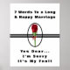 Featuring a delightful design our Funny Wedding Poster is sure to capture everyone's attention. The poster showcases seven words of humorous advice for a long and happy marriage: "Yes Dear, I'm Sorry, It's My Fault." These words serve as a lighthearted reminder of the importance of communication, understanding, and a good sense of humor in a relationship.