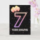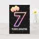 Party balloons and confetti on black background with the neon number 7 for a 7th birthday.
