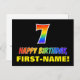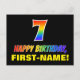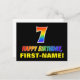 The front of this colourful, fun, and cheerful birthday themed postcard design features a large number "7" and the message "HAPPY BIRTHDAY,", both having a rainbow spectrum gradient inspired pattern colouring, along with a bold yellow editable recipient name. The front also has a minimalist, plain, black coloured background. The back of the postcard has an editable birthday greeting message, or could perhaps be cleared and left blank if a message is to be written by hand instead. A colourful personalised birthday postcard like this might be a fun way to send a message in celebration of somebody’s seventh birthday. [~Z0000474]