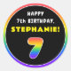 This fun and bold birthday themed round sticker design features the number “7“ with a multicolor rainbow spectrum inspired gradient pattern, along with the message “HAPPY 7th BIRTHDAY,”, and a customisable recipient name. Upbeat stickers like these might be given out or used at a birthday party held for somebody in celebration of their 7th birthday, or perhaps used when preparing invitations or gifts for such an event. [~Z0000637]