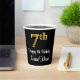 This sophisticated, elegant, and luxurious birthday themed paper cup design features a large ordinal number “7th” having a faux/imitation gold-like look, along with the birthday greeting message “Happy 7th Birthday,” and a custom name in a script-style font. The background is coloured black. Birthday themed paper cups like this might be a fun way to celebrate somebody’s 7th birthday. [~Z0000538]