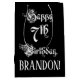 This fancy and formal birthday-themed gift bag design features the message “Happy 7th Birthday,” in opulent script style text, on a black coloured background. It also has a custom recipient name. A lavish birthday themed gift bag like this might be used when giving a gift or present in celebration of somebody’s 7th birthday. [~Z0000557]