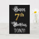 The front of this fancy and elaborate birthday greeting card design features the message “Happy 7th Birthday,”, and an editable recipient name. Some of the message is in a formal script-style text, the large number “7th” features a faux/imitation gold-inspired look pattern, and the background is coloured black. The inside has an editable birthday greeting message, or could perhaps be cleared and left blank if a message is to be written by hand instead. An ornate, personalised birthday greeting card like this might be a respectable way to deliver birthday greetings to somebody who is celebrating their seventh birthday. [~Z0000559]