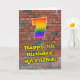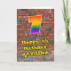 This exciting and fun urban graffiti and street art themed birthday greeting card design features a large number “7” having a colourful rainbow spectrum gradient inspired pattern. It also features the message “Happy 7th Birthday,”, and a customisable name. The background of the front features a brick wall pattern. The inside has a customised birthday greeting message, or could perhaps be cleared and left blank if a message is to be written by hand instead. A colourful, personalised birthday greeting card like this might be used to celebrate somebody’s seventh birthday. [~Z0000586]
