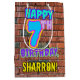 The front of this fun birthday themed gift bag design features the message “HAPPY 7TH BIRTHDAY,” having a colourful, vibrant, urban street art and graffiti inspired appearance, along with an editable recipient name. The background features a brick wall inspired pattern. A vibrant birthday themed gift bag like this might be a fun way to wrap a gift or present being given to somebody who is celebrating their seventh birthday. [~Z0000536]