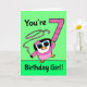 Our little penguin friend is wishing a special little gymnast a happy 7th birthday! She's performing in her pink leotard with ribbon and balancing a big pink confetti number 7. Card background is a fun green. Original illustration by Bethany J. Mitchell of Darcy Place Studio.
