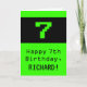 This nerdy and geeky birthday-themed greeting card design features a large green classic video game style number "7" on the front. It also features the birthday greeting message "Happy 7th Birthday,", and a personalised name. The inside features a customisable birthday greeting message, or could perhaps be cleared and left blank if a message is to be written by hand instead. A nerdy customisable birthday card like this might be a fun way to send a message in celebration of somebody’s seventh birthday. [~Z0000430]