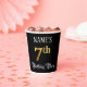 This fancy and opulent birthday paper cup design features an editable name and the message “7th Birthday Party”. The large number “7th” has a faux/imitation gold-inspired colouring pattern, the words “Birthday Party” are in ornate script-style text, and the background is coloured black by default (although it can be customised). Elegant, ornate paper cups like this might be useful to have at a birthday celebration being held to celebrate somebody’s seventh birthday. [~Z0000567]